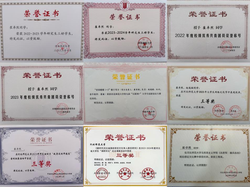 在专业学习方面,崔卓然一直将学习作为自己的第一要务。研究生在读期间平均学分绩点3.8,连续两年获评研究生一等学业奖学金、研究生三好学生以及校级优秀共青团员等。在科研方面,参与厅局级科研项目2项、院级研究生创新资助项目2项,在省级期刊发表多篇论文。她积极参加各种竞赛活动,荣获第九届“互联网+”大学生创新创业大赛校级优秀奖、“我身边的师德美”案例征集活动校级三等奖、河北师范大学2023年大学生网络文化节三等奖等。
