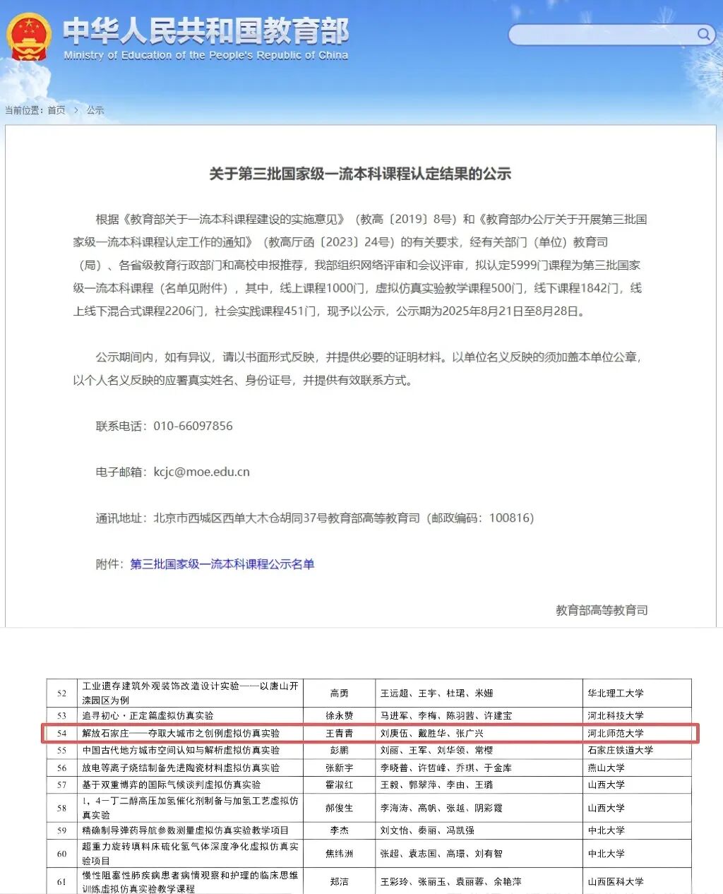 近日,教育部公示了第三批国家级一流本科课程认定结果名单,学院王青青、刘庚伍、戴胜华、张广兴教学团队申报的《解放石家庄——夺取大城市之创例虚拟仿真实验》课程入选国家级一流本科课程。