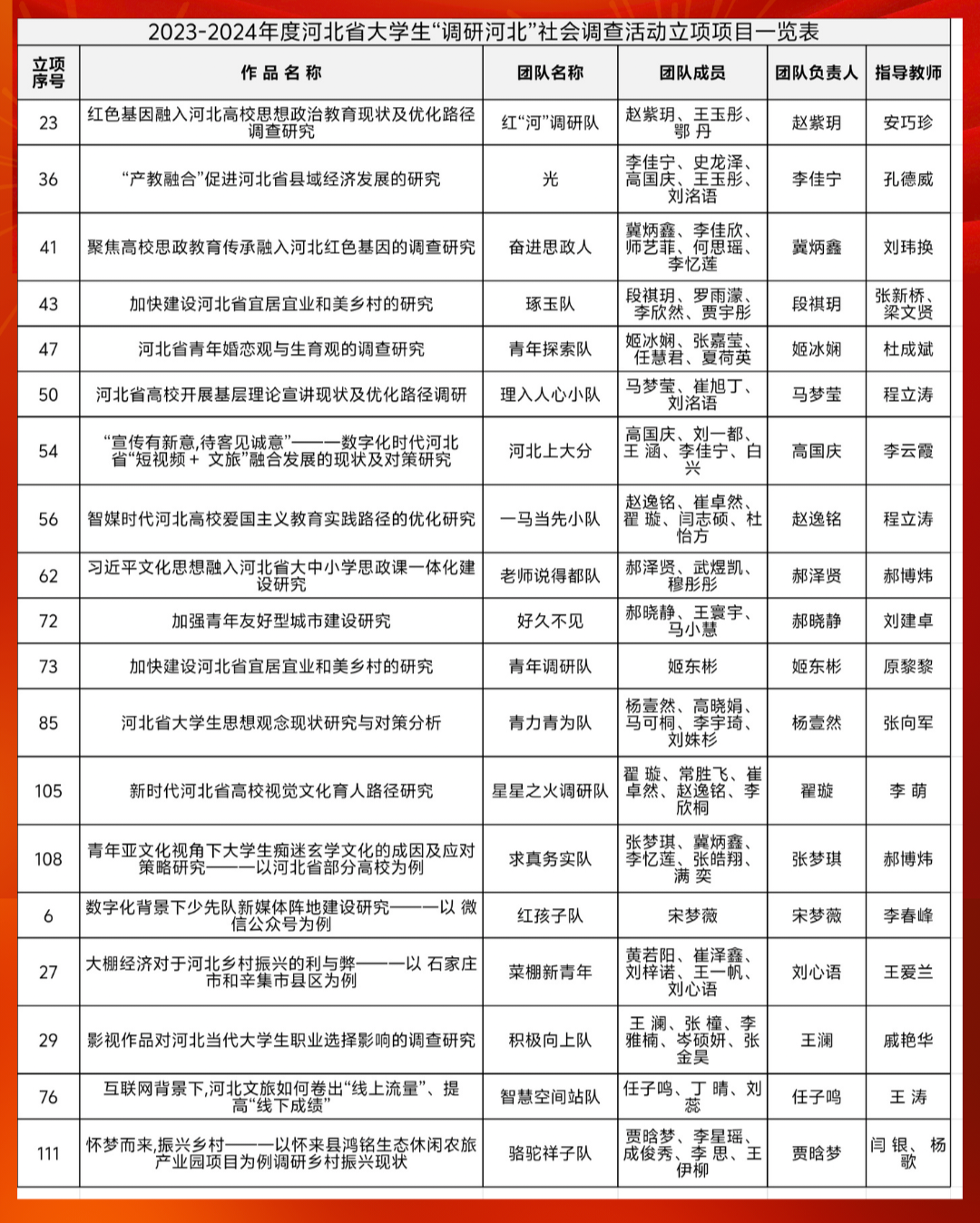 近日,由共青团河北省委、河北省社科院、河北省学生联合会共同举办的2023-2024年度“调研河北”社会调查活动立项名单公布。经有关专家评审,学校共计立项121项,其中香港六合彩结果 师生共有19个项目获批立项。